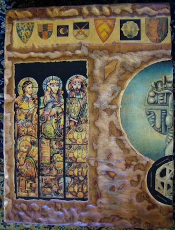 This is one of the first large books Tighe created. The wood cover was distressed and stained, digital images affixed and enhanced, molten glass beads added. The hammered bronze medallion, fashioned years before and by now well patinated and aged, had been left on a shelf to await a use. It seemed perfect for the inclusion on the book cover.