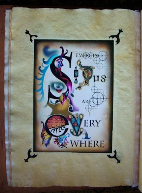 The title page, combining a digital image on vellum with free-form ink filigrees at the corners.